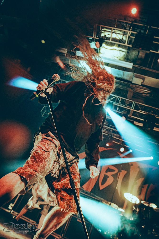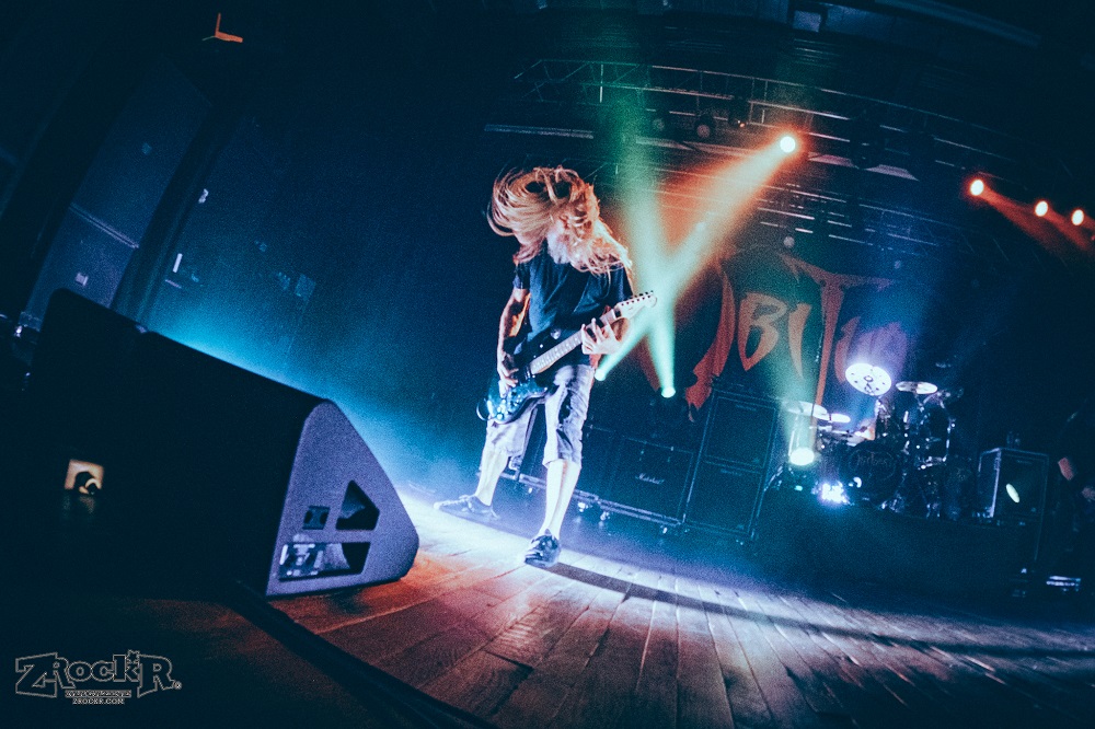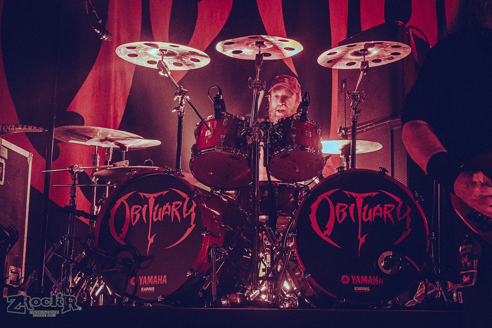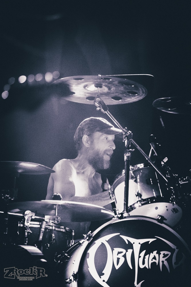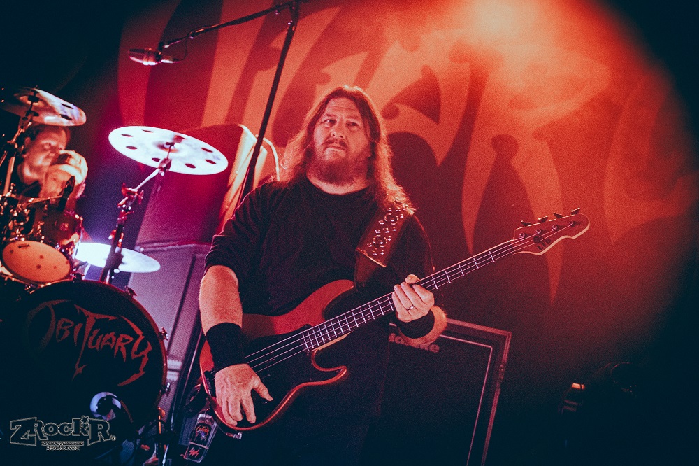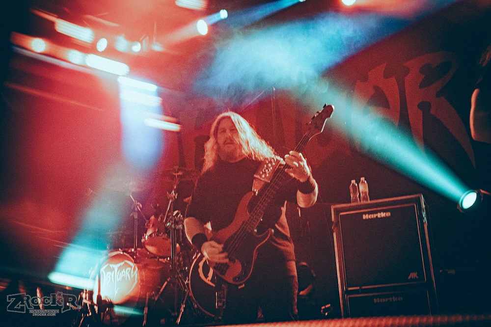 At 9:30 PM, Obituary came out to play. They are a well-known death metal band. They played very heavy and powerful music. The band was very good, and the crowd cheered loudly. Everyone was excited to see them. The music was loud and clear, and the energy in the room was high.