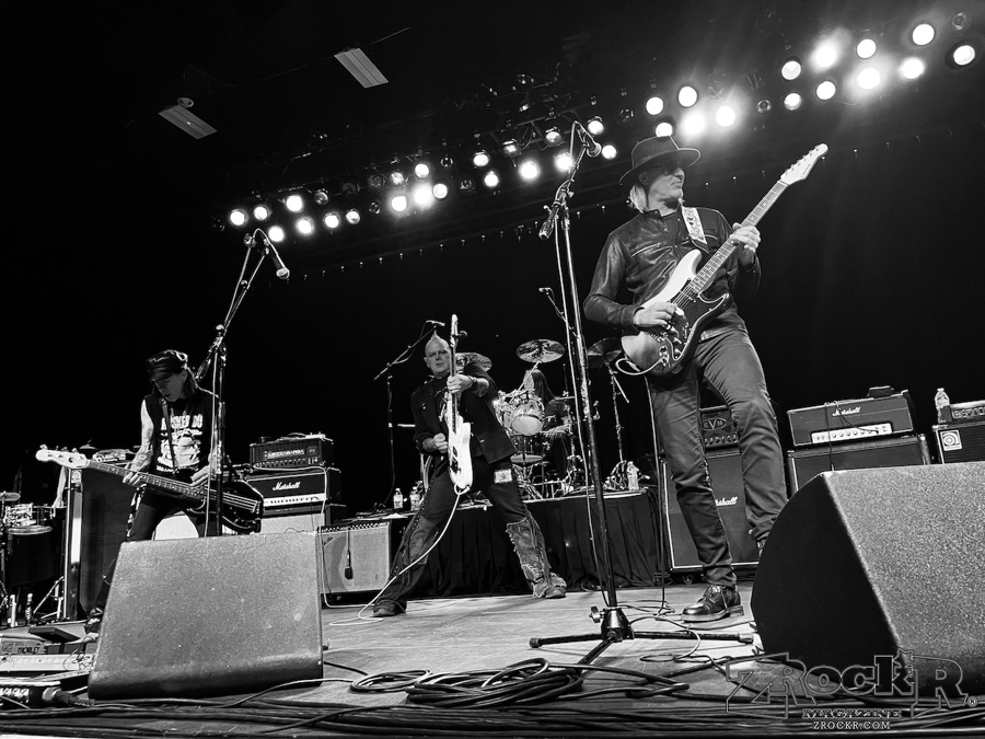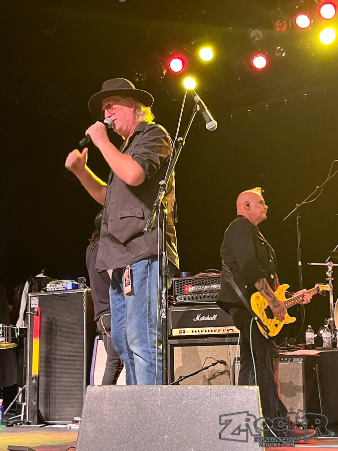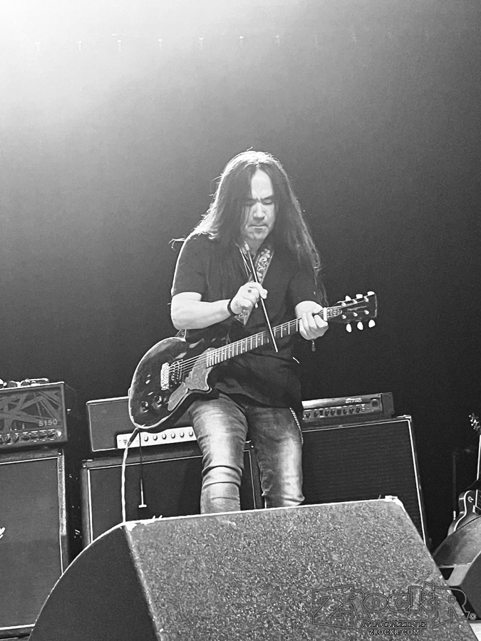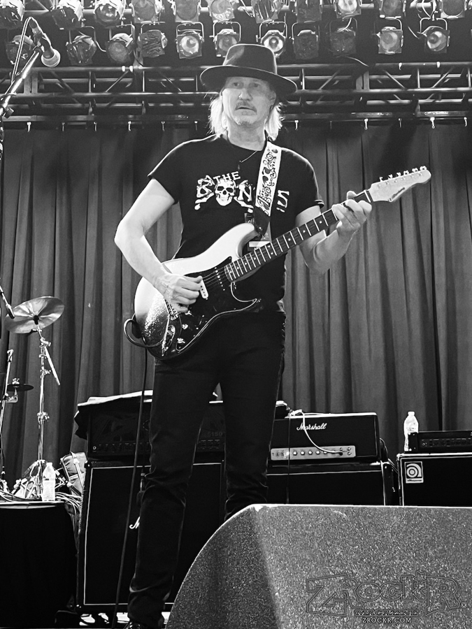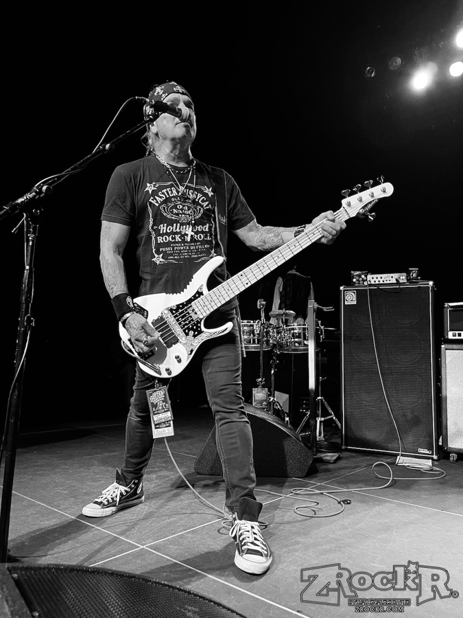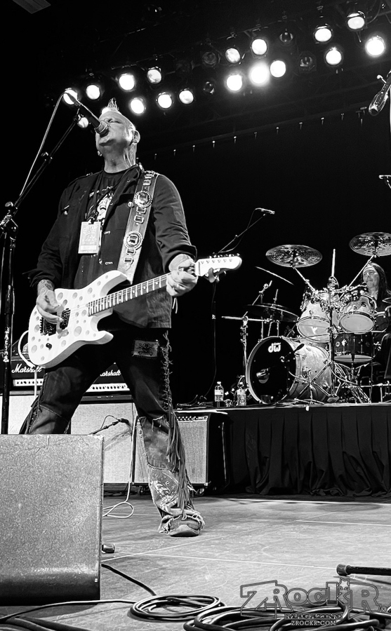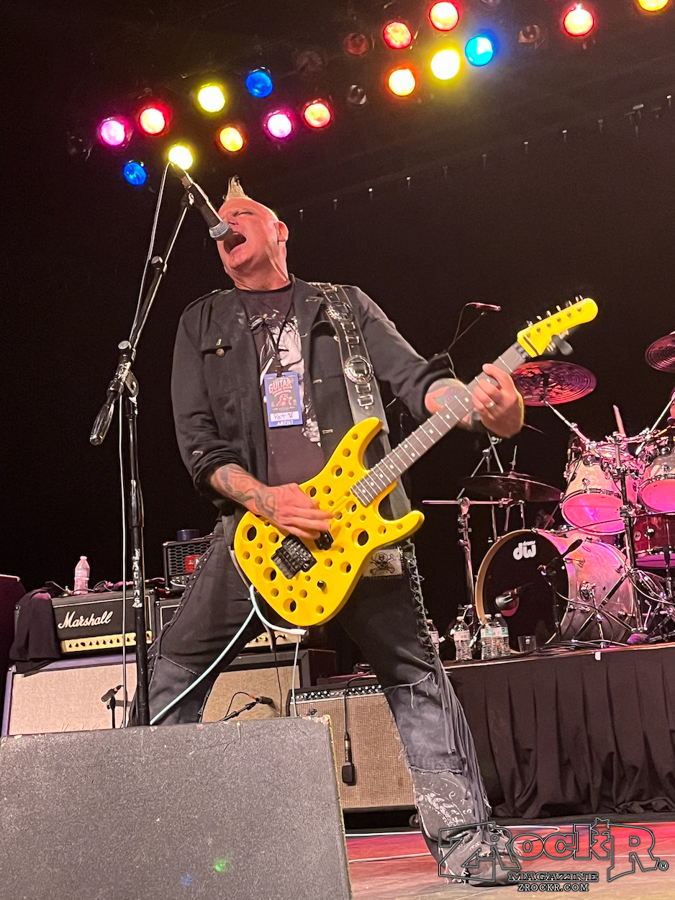 When I arrived Friday night, most of the vendors had already left for the night, but the promise of two bands performing live shows certainly sparked my interest. I did encounter a few music scene personalities in the venue, including Shrapnel Records founder Mike Varney, who is always a pleasure to speak to. I explored the (mostly empty) vendor booths while waiting for the evening’s entertainment, and first up was The Bones, fronted by Patrick Vitagliano. The group usually features Armored Saint guitarist Jeff Duncan, but due to his absence on account of a tour, he was replaced for the evening by Stoney Curtis! The transition was seamless; you’d swear Stoney was always in this band if you didn’t know better. Their mixture of punk and power pop sounds entertains every single time, and they even reinvent some older songs in cover versions, including tunes by INXS, The Cars, and Prince, to name a few, though this set was surprisingly heavy on original material, which is a good thing. Vitagliano is certainly an eccentric frontman in all the best ways; this guy’s between-song rants are as entertaining as the music! Plus, I can’t say I’ve ever encountered another musician who plays a guitar shaped like a block of cheese, complete with holes. Also playing with the band were bassist Sean Koos, who has quite the resume of his own, and drummer Daniel Margasa.