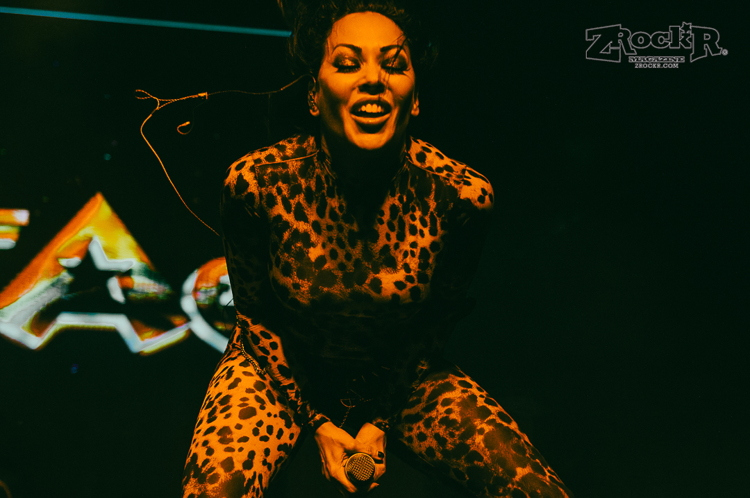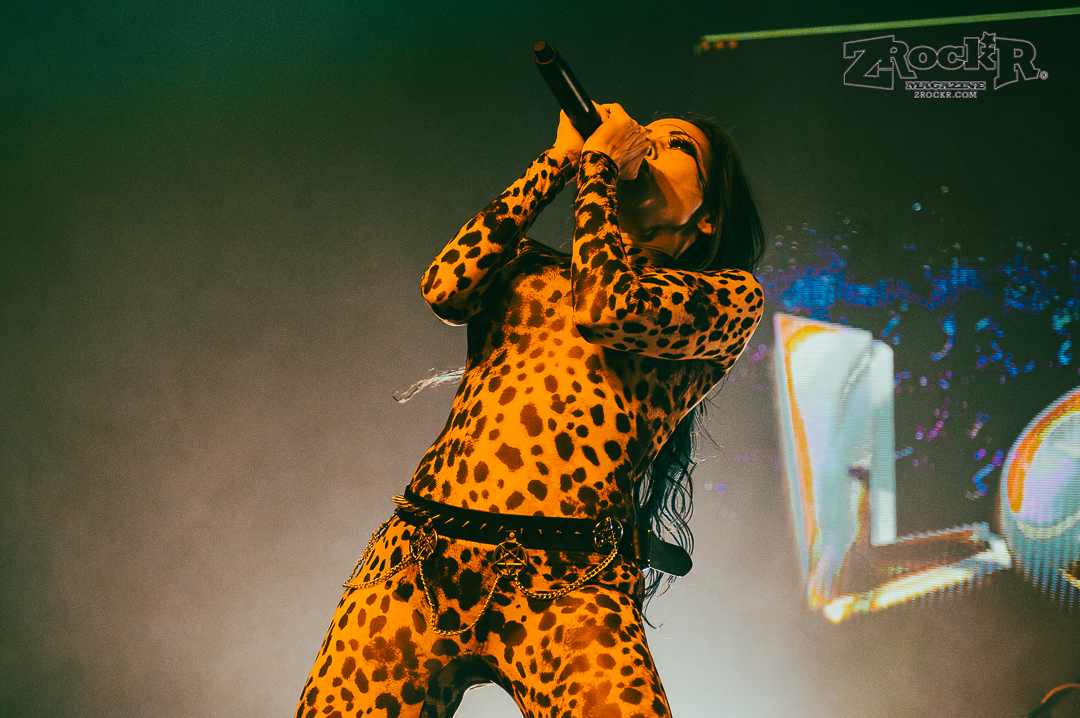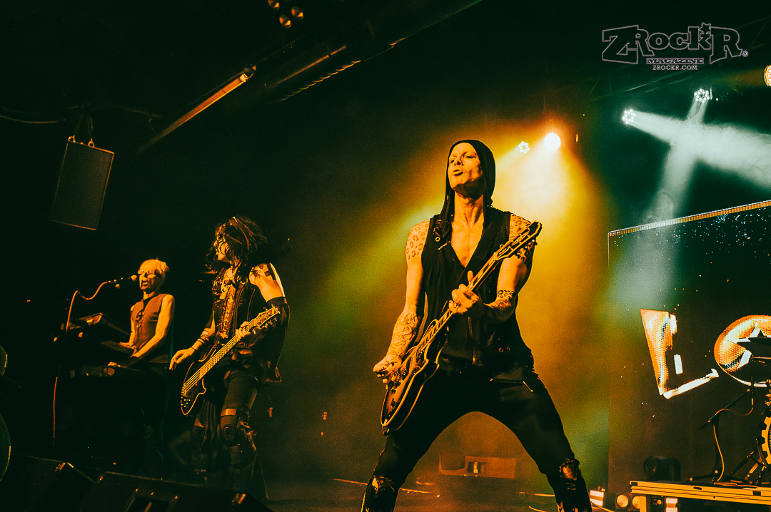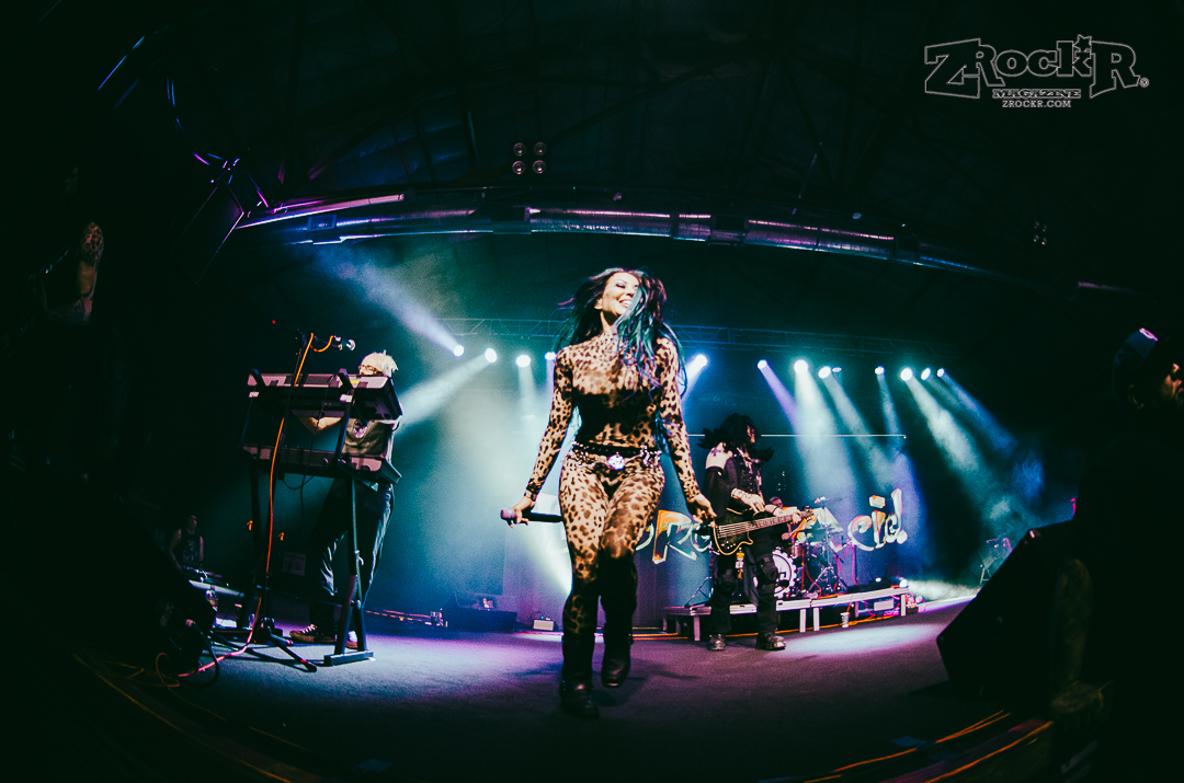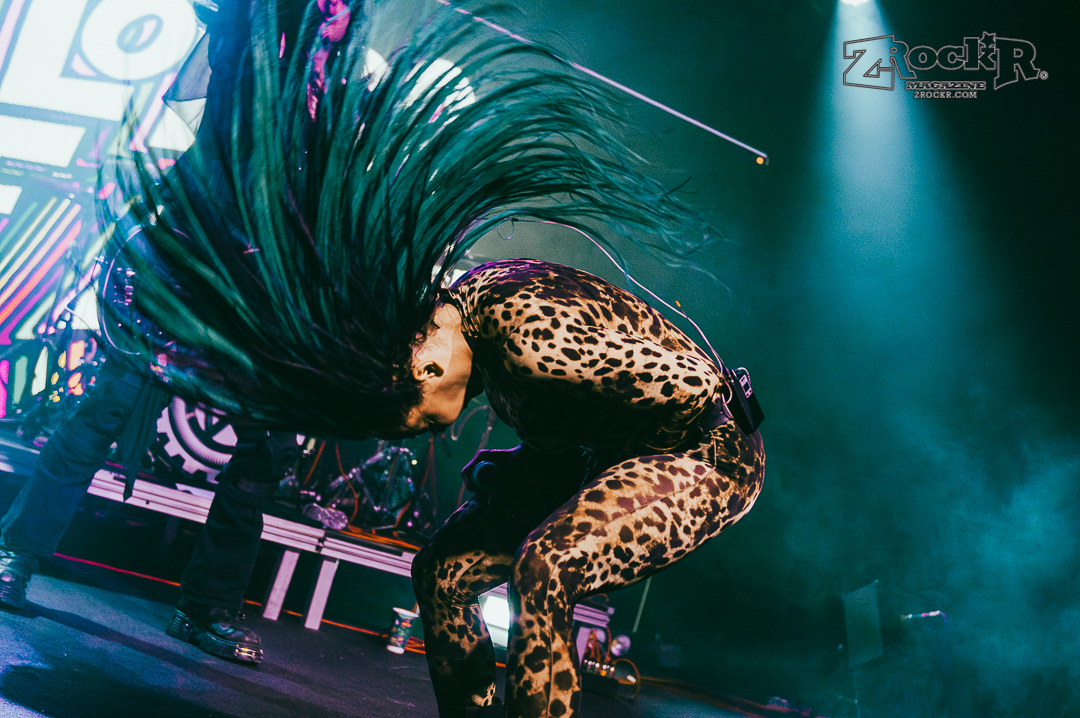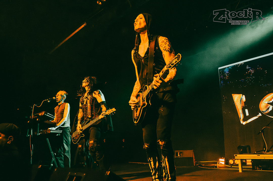 Then it was time for one of the more memorable moments of the night. Myself, the other two photographers, and even the security guards were all confused. We were all at a concert, that we were sure of, and yet there were no instruments or music equipment anywhere. Weird. At the time, when I had last checked Spotify, the next group up — Little Miss Nasty — had a bunch of listens and they sounded a lot like an all-female techno pop group. At least, that’s what I had assumed. Oh, man, was I wrong. By the time any of us at the barricade knew what was happening, there were five women in black thongs, ripped tights, X-shaped pasties, and leather accents crawling all over the metal bars before us. Yep, you guessed it. Apparently, Little Miss Nasty is a famous industrial metal burlesque troupe, and though they have some music out on streaming, most of their set is them dancing to remixed versions of songs by such groups as Rage Against the Machine, Rob Zombie, A Perfect Circle, and Nine Inch Nails. My first thought was: “how is this allowed at an all ages show?” My second thought was “I need to start researching opening acts/bands more thoroughly.” And my third thought was “my girlfriend is going to skin me alive.” All were true and fair, and the shock of it all aside, they are some very talented ladies. I don’t think most people know how impressive it is to be able to hang upside down from a monkey bar without using your hands, much less do it while pretending to eat out your fellow performer. Ladies, if you’re reading this, drop the ab routine. Lord knows I need it.