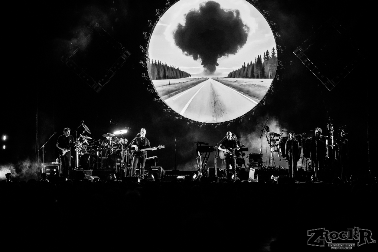 From the moment the lights went down, the crowd was enthused. The setup of the stage and background was quite elaborate, with well-planned lighting work, and even a video screen to show appropriate images, whether it was warlike imagery, pigs, an overbearing mother figure, and various flying machines, again depending on what the song in question required. An image of the famed DARK SIDE OF THE MOON album cover was even accompanied by lights across the crowd of the beam of white light and the refracted rainbow light, which got quite the reaction from the crowd. The spotlights were a bit aggressive at times, and I did get them in my eyes quite often from my floor seat, but was still wildly impressed by what the production offered. Even prior to the show starting, this screen showed old black-and-white footage of the band with founding member Syd Barrett, including the band being interviewed by Dick Clark.
