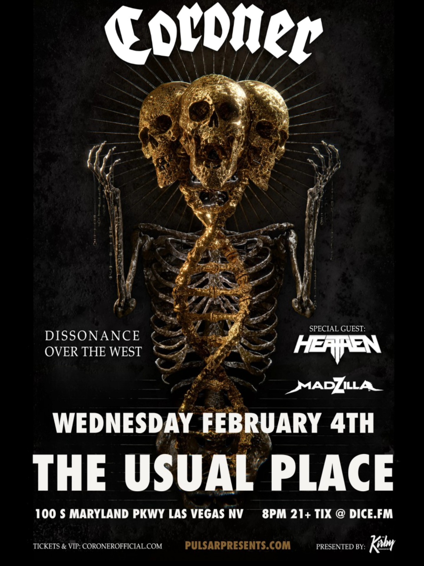 February 4, 2026 – Swiss thrash band CORONER kicked off the Dissonance Over the West tour at The Usual Place in Downtown Las Vegas with special guests, HEATHEN, along with local openers, MADZILLA.